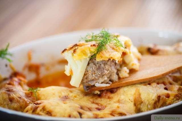 капуста цветная, фарш из курицы, жирный, сыр тильзитер, сыр плавленый, вода, сметана 18% жирности, лук репчатый, чеснок, масло сливочное 72%, соль поваренная пищевая, смесь перцев