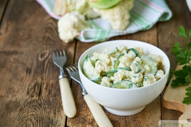 капуста цветная, огурец грунтовый, яйцо куриное, майонез , сметана 18% жирности, лук репчатый, петрушка, соль поваренная пищевая, яблочный уксус