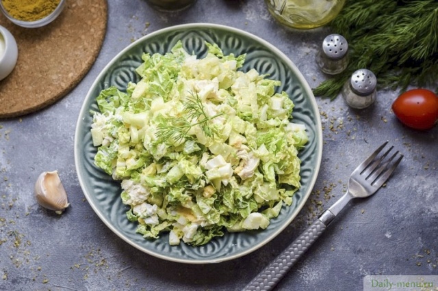 капуста пекинская, курица филе, без кожи, яйцо куриное, сыр голландский, майонез , укроп и другие пряные травы, соль поваренная пищевая
