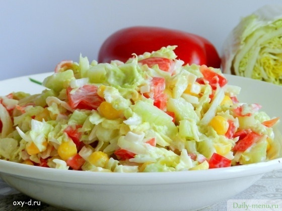 капуста пекинская, кукуруза консервы, перец красный сладкий, крабовые палочки, лук репчатый, майонез на перепелином яйце 67%