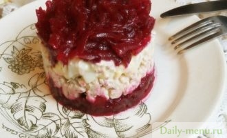 картофель отварной, морковь, свекла вареная, филе куриное, сметана 10,0% жирности, укроп и другие пряные травы, соль поваренная пищевая