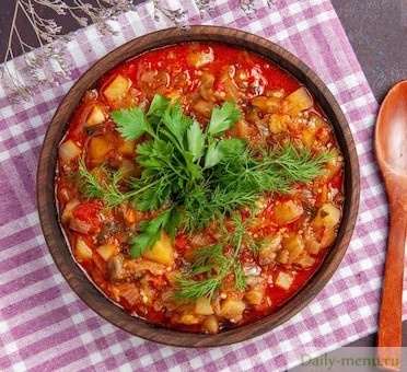 помидоры, кабачок, баклажаны, тофу, морковь, перец болгарский красный, томатная паста, вода, укроп обыкновенный, масло оливковое, базилик свежий, соль поваренная пищевая