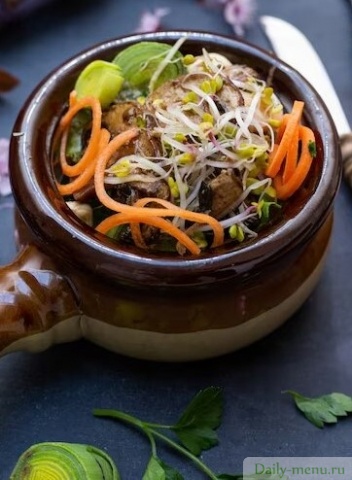 шампиньоны, цукини, брокколи, морковь, лук-порей, чеснок, масло оливковое, петрушка, укроп обыкновенный, соль поваренная пищевая, перец черный молотый, перец чили