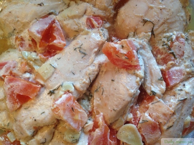 куриная грудка, без кожи, йогурт 1,5% , помидоры, укроп и другие пряные травы, горчица столовая, чеснок