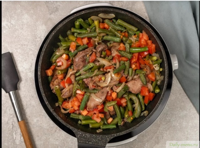 куриная печень "троекурово", вода, фасоль стручковая, помидоры, лук репчатый, мука цельнозерновая, масло сливочное 61,5% жирности, бутербродное, чеснок, перец черный молотый