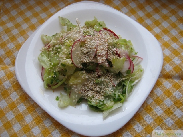 салат, редис, лук зеленый, лук-порей, сельдерей черешковый, масло оливковое, кунжут-семя, соль поваренная пищевая
