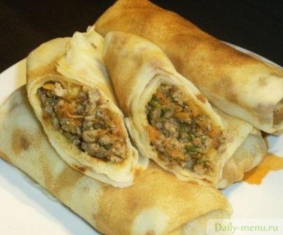 Блинчики с мясом, луком и морковью.