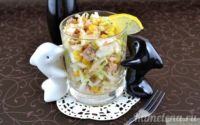 капуста пекинская, тунец в масле консервы, сладкая кукуруза консерва, лук репчатый, масло подсолнечное, сок лимонный