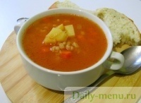 вода, картофель, крупа перловая, лук репчатый, морковь, масло подсолнечное, томатная паста, соль поваренная пищевая, перец черный молотый