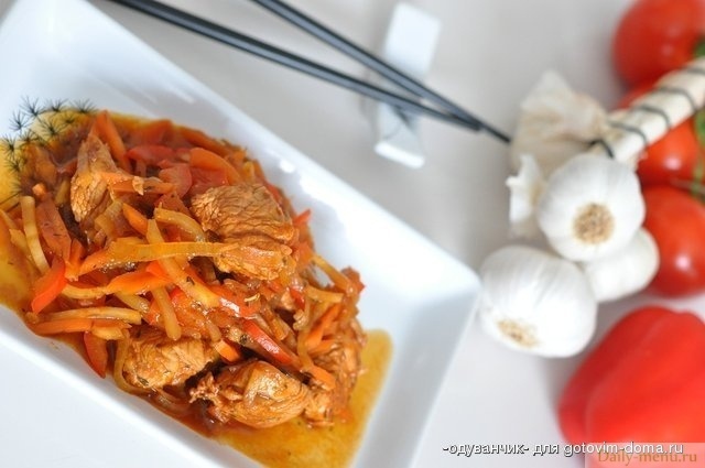 индейка, грудка без кожи, морковь, сельдерей, корень, перец красный сладкий, лук репчатый, томатная паста, соевый соус, масло подсолнечное