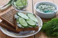 хлеб бородинский, творог, 0 % , огурец грунтовый, укроп и другие пряные травы, сметана 10,0% жирности, лук зеленый, соль поваренная пищевая