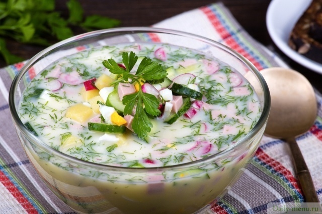 картофель вареный, колбаса вареная докторская, огурец грунтовый, яйцо вареное, редис, сельдерей черешковый, петрушка, укроп и другие пряные травы, лук зеленый