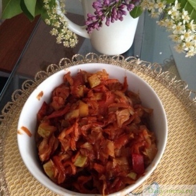 перец сладкий, капуста белокочанная, кабачок, морковь, лук репчатый, томатная паста, соевый соус