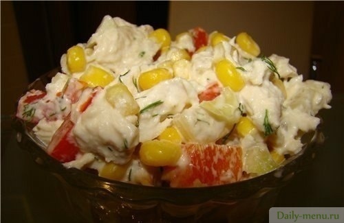 вода, филе куриное, кукуруза консервы, ананасы консервированные, яблоки, перец болгарский красный, майонез провансаль "ряба", укроп обыкновенный, соль поваренная пищевая, перец черный горошек, лавровый лист