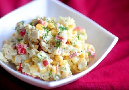 крабовые палочки, кукуруза консервы, яйцо куриное, рис белый, йогурт 1,5% , лук репчатый