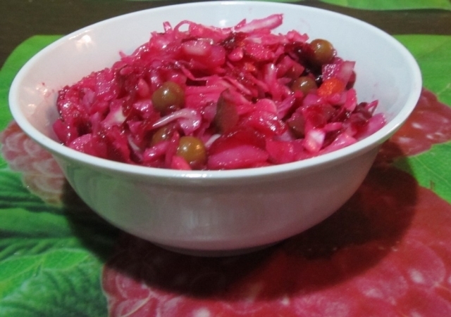 капуста квашенная, картофель отварной, горошек зеленый "союзная марка", огурцы маринованные, свекла вареная, лук репчатый, масло подсолнечное