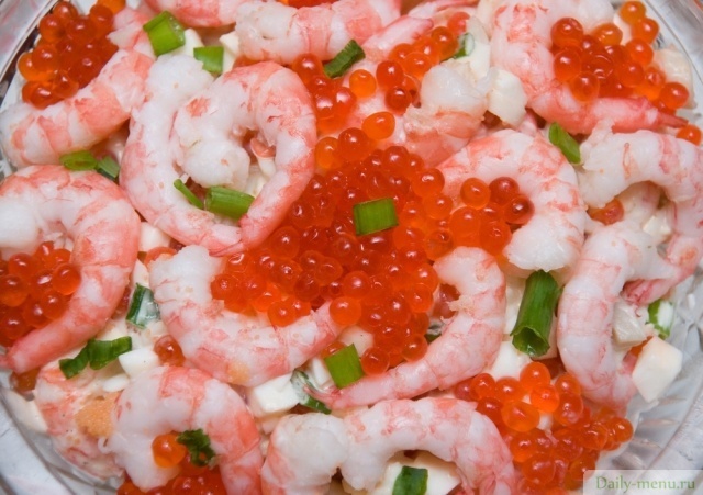 креветки в панцире, кальмар (мясо), яйцо куриное, крабовые палочки, икра кеты зернистая, майонез , укроп и другие пряные травы