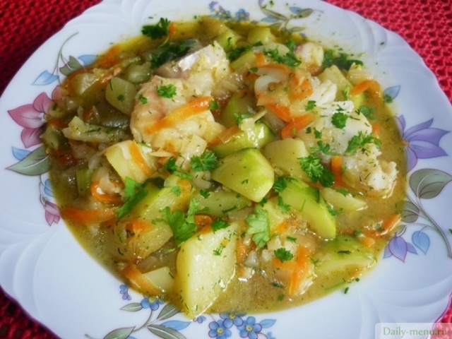 филе хека, кабачок, картофель, лук репчатый, морковь, лук-порей, сельдерей, корень, укроп и другие пряные травы, чеснок, соль поваренная пищевая, перец черный молотый