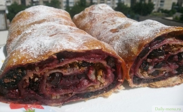 вишня консервированная, слоеное тесто бездрожжевое, орех грецкий, яйцо куриное, сахар-песок, сахарная пудра