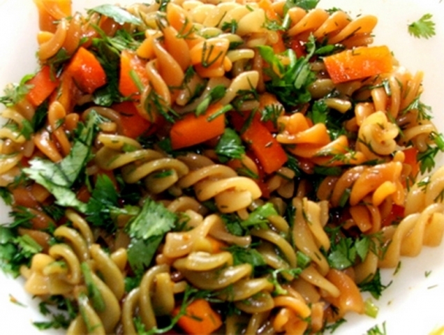 пастрома из курицы, макароны из муки в/с, помидоры, горошек зеленый, сметана 10,0% жирности, салат, укроп и другие пряные травы, соль поваренная пищевая
