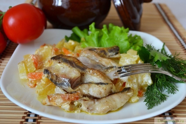 судак, картофель, морковь, сметана 20,0% жирности, лук репчатый, вода минеральная, масло сливочное 72%, перец черный молотый, соль поваренная пищевая