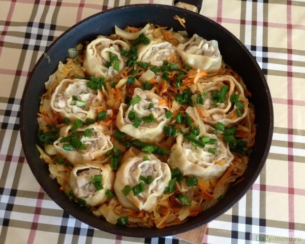 фарш из говядины, тесто пельменное, капуста белокочанная, вода, капуста белокочанная, квашеная, морковь, кабачок, лук зеленый, масло подсолнечное, соль поваренная пищевая