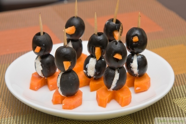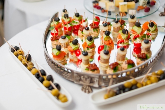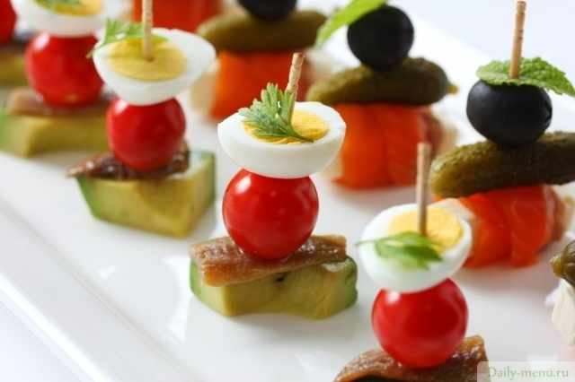 Закуска из авокадо, сельди с помидорами черри на шпажках