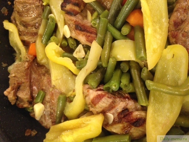 филе бедра индейки индолина, фасоль стручковая, перец красный сладкий, лук репчатый, морковь, чеснок