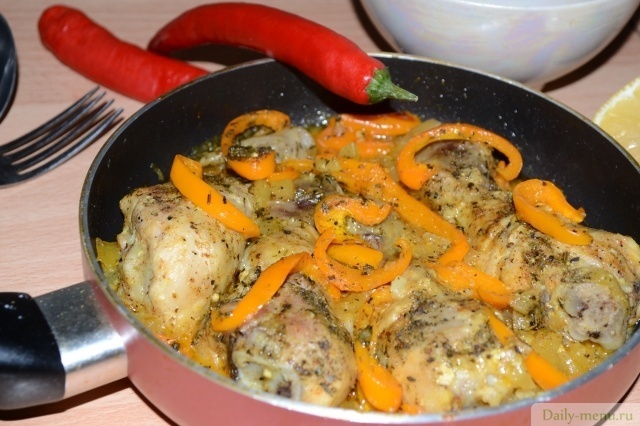 куриный окорочок, манго, сливки, 20,0% жирности, перец сладкий, лук репчатый, чеснок, паприка сушёная, молотая, базилик сушеный, зира (кумин), куркума