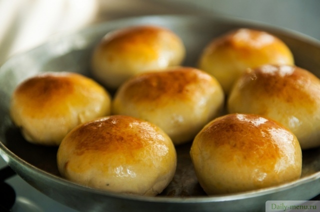 фарш из говядины, тесто пирожковое, лук репчатый, масло подсолнечное, яичный желток куриный, молоко 2,5% , масло сливочное 72%, соль поваренная пищевая, перец черный молотый