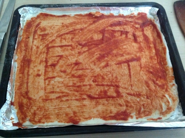 тесто дрожжевое (покупное), фарш из говядины, сыр пошехонский, помидоры, томатная паста, лук репчатый, масло подсолнечное