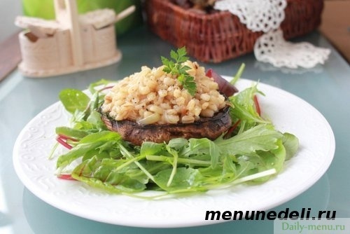 шампиньоны, вино сухое, бульон овощной, лук репчатый, масло подсолнечное, крупа перловая, салат, сок лимонный, петрушка, соль поваренная пищевая, сахар-песок, чеснок, перец черный молотый