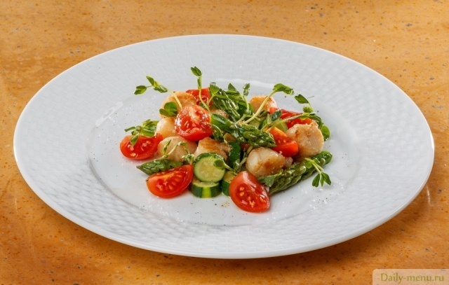 кабачок, спаржа, филе морского гребешка, помидоры, смесь японских специй «курикаки», масло оливковое, проростки маша, масло подсолнечное, сок лимонный, соль поваренная пищевая, перец черный молотый