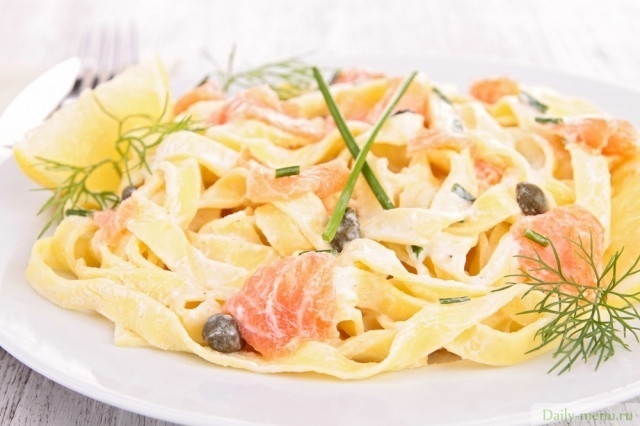 вода, паста (спагетти), семга слабосоленая , сливки, 20,0% жирности, сыр пармезан, базилик сушеный, орегано сушеный