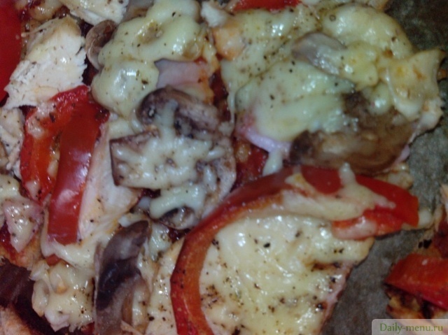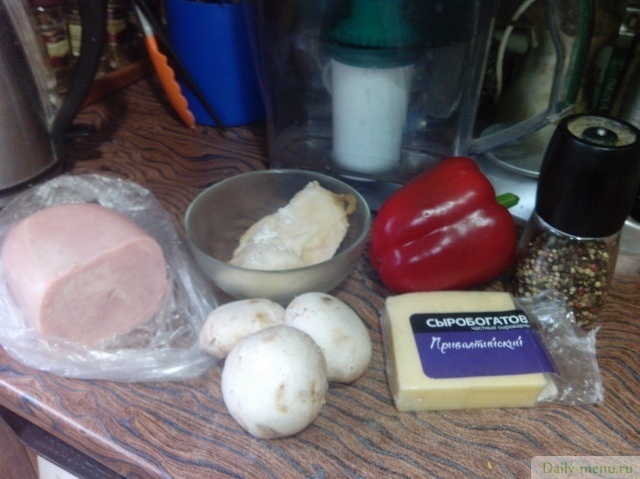 творог, 5 % , мука цельнозерновая, ветчина из индейки"коровино", перец красный сладкий, яйцо куриное, куриная грудка, без кожи, шампиньоны, сыробогатов, томатная паста, чеснок, соль поваренная пищевая, перец черный молотый, пищевая сода, базилик сушеный