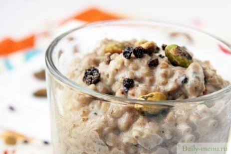 вода, молоко 1,5%, гречневая крупа ядрица, курага, изюм, орех грецкий, ванилин, кардамон, корица