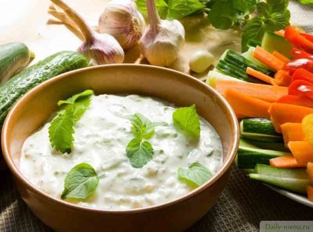 йогурт натуральный 3.2%, огурец грунтовый, чеснок, масло оливковое, сок лимонный, укроп и другие пряные травы, мята свежая, соль поваренная пищевая