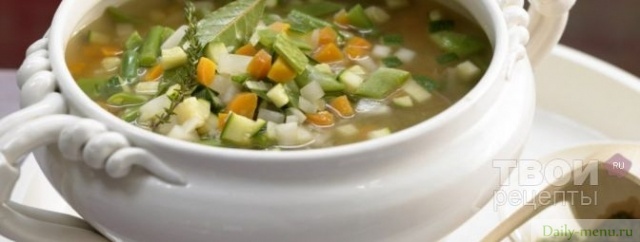 вода, кабачок, фасоль стручковая, помидоры, репа, морковь, лук репчатый, масло оливковое, чеснок, анчоусы атлантические, соль поваренная пищевая, базилик сушеный, тимьян, лавровый лист, перец черный горошек