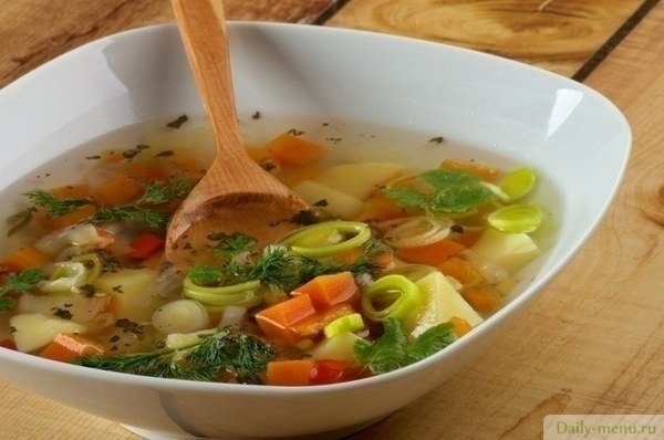 вода, капуста белокочанная, лук репчатый, лук-порей, сельдерей черешковый, морковь, перец сладкий, помидоры, перец чили, петрушка, карри, масло оливковое