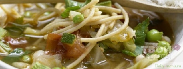 вода, кабачок, фасоль красная, консервированная, горошек замороженный, сельдерей черешковый, капуста пекинская, помидоры, макароны из муки в/с, лук репчатый, сыр пармезан, масло оливковое, соль поваренная пищевая, чеснок, перец черный молотый