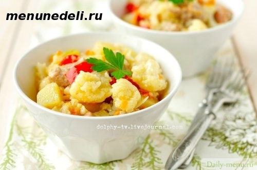 капуста цветная, индейка, грудка без кожи, картофель, перец сладкий, масло подсолнечное, лук репчатый, морковь, перец черный молотый, соль поваренная пищевая