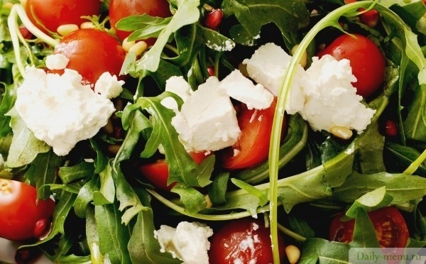 помидоры, салат, сыр брынза сербская, рукола, сок лимонный, масло оливковое