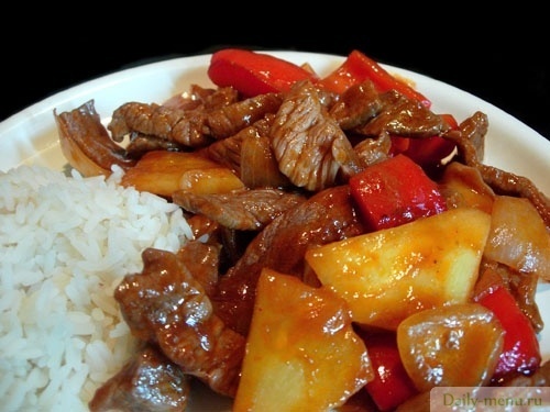 Говядина с ананасами в кисло-сладком соусе