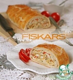 курица филе, без кожи, кабачок, слоеное тесто бездрожжевое, морковь, лук-порей, яйцо куриное, перец болгарский красный, молоко 1,5%, яичный желток куриный