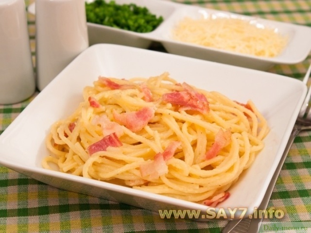 паста (спагетти), бекон, сливки, 20,0% жирности, яичный желток куриный, сыр пармезан, масло оливковое