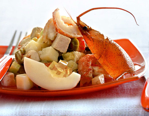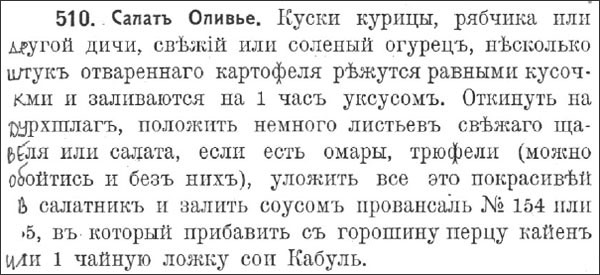 В оригинальном рецепте оливье готовился из поджаренных ломтиков мяса куропаток и рябчиков, вокруг располагались вареные шейки раков, нарезка телячьего языка, паюсная икра. В середину помещалось трио из перепелиных яиц, корнишонов и отварной картошки. Перед подачей салат полагалось полить специальным соусом «Провансаль», который Люсьен придумал, разумеется, сам, держа рецепт в тайне.